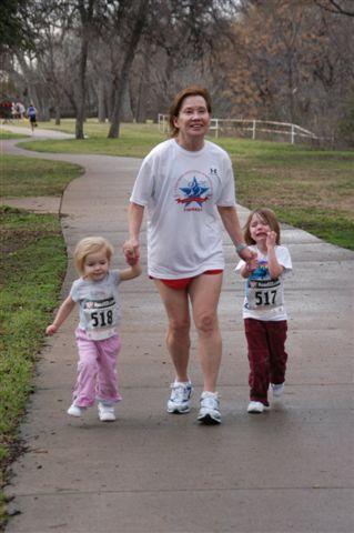 | Richard Hamilton being chased by Elizabeth Judd and Karen Castro. Karen, show your bib number for the finish line crew. | |