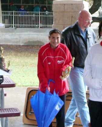 | The OA female winner of the 15K was Sheila Natho (F40-44), in 1:07:30. Frances McKissick (F45-49), was second in 1:10:43, which also won her the top master award. These are fast times for the 15K on a rainy, cold day. Sheila and Frances were part of the 17 recognized for achieving age group records earlier this year. Jeanne Pitz (F55-59), won the senior title in 1:33:44. |