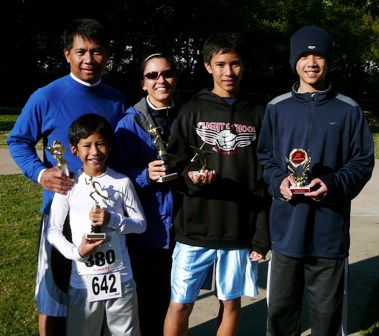| The Ishii family had three members take home awards from the 5K race. Hideo (M7-9), won first in his age group by completing the course in 27:37. Hiroshi (M13-15), took home 3rd in his age by running a fast 21:40. Tami, (F35-39), was second in her age group with a 27:14 time. This is quiet an accomplishment. In October they took home 5 awards. We may need to create a new awards category for families that run together. Congratulations. |