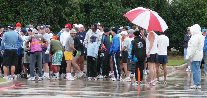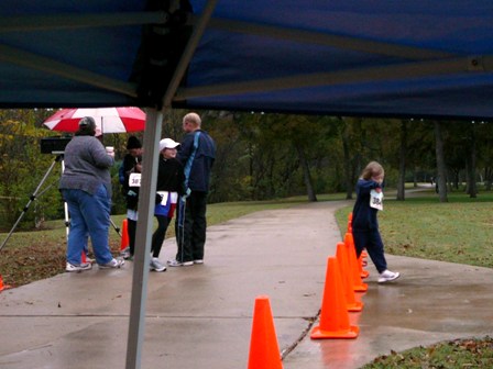 Unlike October’s perfect race day weather, Mother Nature tried to show us she was in charge at the November race. We recognized the challenges and still had 130 participants, plus the volunteers, braved the cold and rain to compete in the 5K, 15K or Kids’ K. Thanks to James Gabhart and his space age tent, the weather did not prevent us from using our finish line technology to record the race statistics and display the results at the gazebo in nearly real time. Thanks to having a mobile toys table, none of the over 40 gifts got wet. Thanks to the many volunteers stepping up to help compensate for our 6 regulars either out of town or sick. Mother Nature tried, but on this Saturday morning, the Plano Pacers were the winners. |